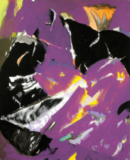 Die Übergänge zwischen diesen Farbfeldern sind mal sanft und fließend, wie feine Adern im Gestein, mal werden sie durch kräftige, schwarze Linien markant akzentuiert. Diese grafischen Eingriffe verstärken die Wirkung der Komposition und verleihen den Arbeiten Struktur und Spannung.
