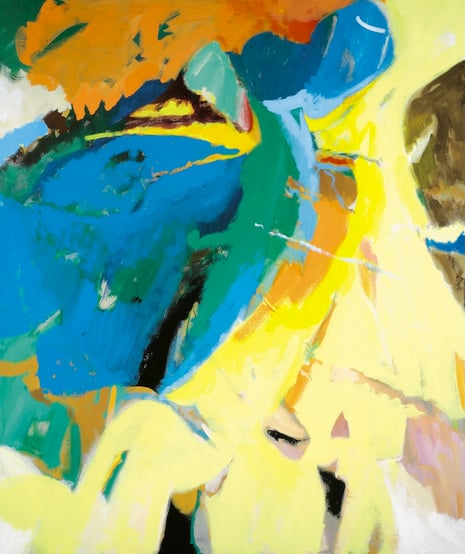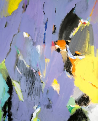 Transitions between these fields of color are sometimes soft and fluid, like delicate veins in stone, while at other times they are sharply defined by bold black lines. These graphic interventions enhance the overall composition, adding both structure and tension to the work.
