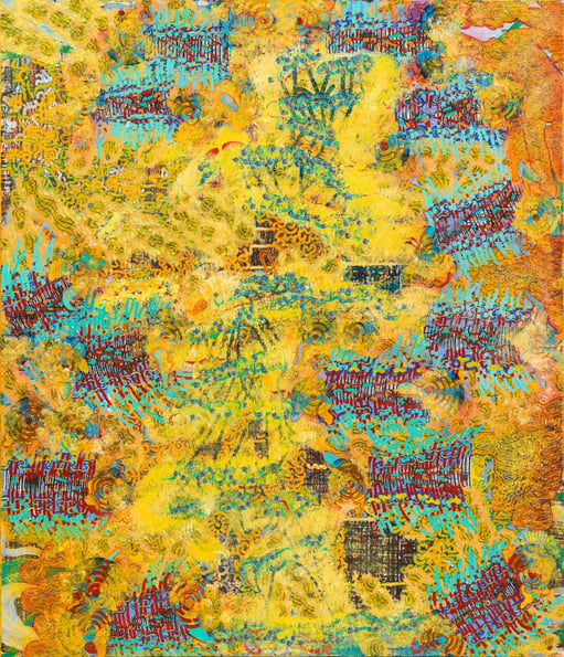 She has found harmony and inspiration in the Pannonian region of Austria, where she now lives and works. It is here that her vibrant, large-scale works take shape—magical compositions filled with luminous color. Meandering motifs, often combined with simplified animal forms, interweave into intricate networks of lines, creating a visual language that is both dynamic and contemplative.