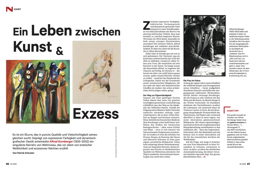 Until his death in Vienna in 2002, Kornberger produced an extensive oeuvre of more than 2,500 works. In the years that followed, his artistic legacy was systematically reviewed, documented, and archived. His family established a foundation to preserve and promote his work. Alongside publications and exhibitions, a comprehensive catalogue raisonné was developed to systematically record his graphic and painterly output. Alfred Kornberger remains remembered as a distinctive and uncompromising figurative artist, whose work continues to impress through its emotional immediacy and artistic integrity.